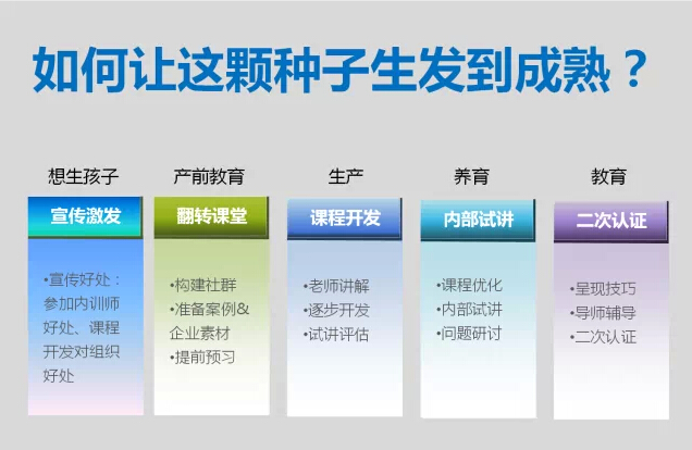試管嬰兒模式:外面有一些課程的素材和胚胎,內訓師自己根據這些素材來進行內化(孕育),然后再生產。這樣的好處是讓內訓師可以多了解外面的標準化知識。