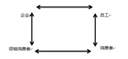 從上圖可以看出,企業(yè)位于方形的左上角,領(lǐng)袖消費(fèi)者位于左下角,消費(fèi)者位于右下角,員工位于右上角。方形營銷的基本原則是:在消費(fèi)者眼中,如果一個(gè)品牌或者一家公司的投入足夠多,對(duì)消費(fèi)者產(chǎn)生足夠大的吸引力,那么就能使這些消費(fèi)者成為積極主動(dòng)的消費(fèi)者或者領(lǐng)袖消費(fèi)者;相反,如果消費(fèi)者與品牌或企業(yè)的行為理念相左,他們也會(huì)表現(xiàn)出同等強(qiáng)度的負(fù)面影響力。